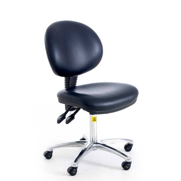 A gas-lift high comfort chair with static dissipative upholstery, for use in EPAs and Class 10,000 Clean Rooms, meeting the requirements of BS EN 61340-5-1:2016