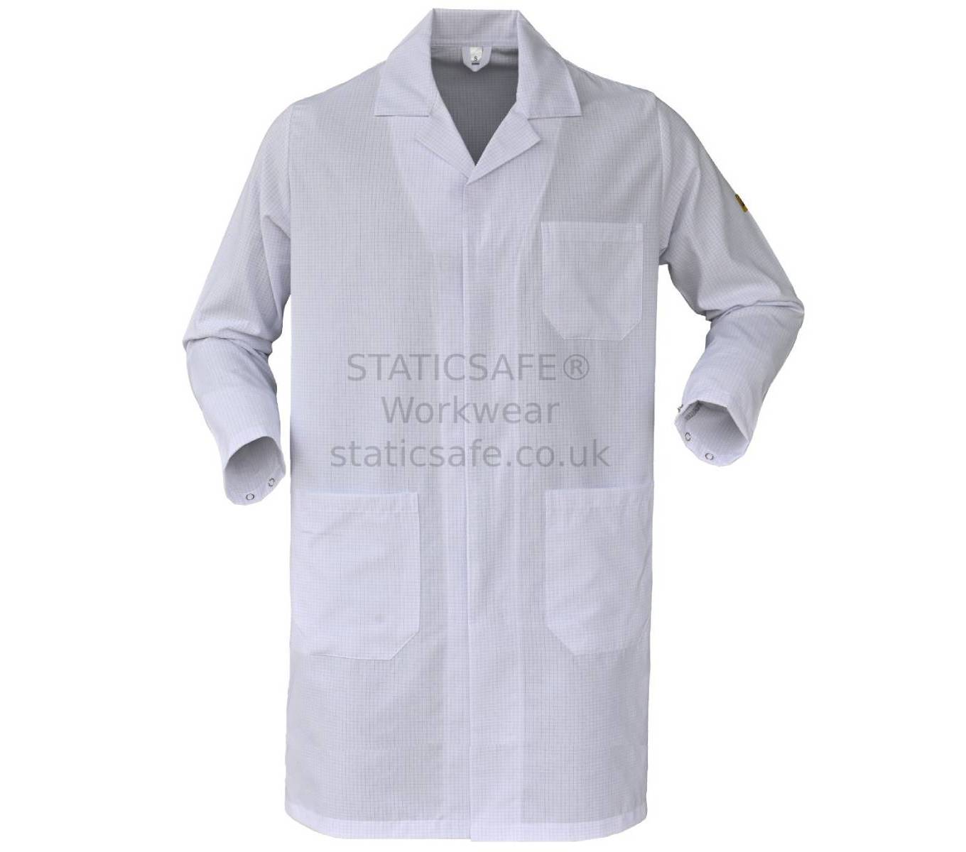 STATICSAFE® Anti-static ESD White Lab Coat, part of the STATICSAFE® Workwear range. STATICSAFE® Workwear is sourced and manufactured by Static Safe Environments (SSE) specifically for use in an Electrostatic Protected Area (EPA). Only premium quality fabrics are used to ensure comfort, durability, and static control performance. Only clothing under the STATICSAFE® brand bought directly from SSE can be guaranteed authentic.